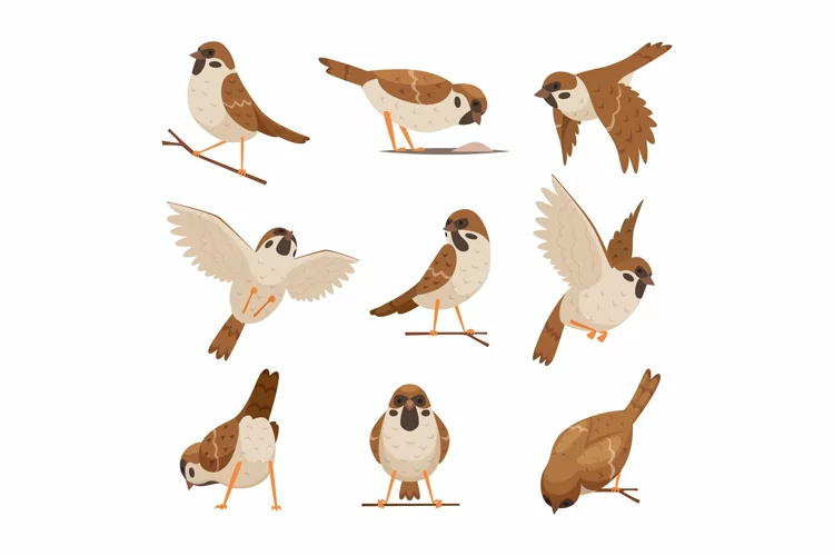 Cartoon sparrows. Wild funny animals flying brown birds moving chirp characters exact vector pictures set cute birds. Illustration of wild animal sparrow character