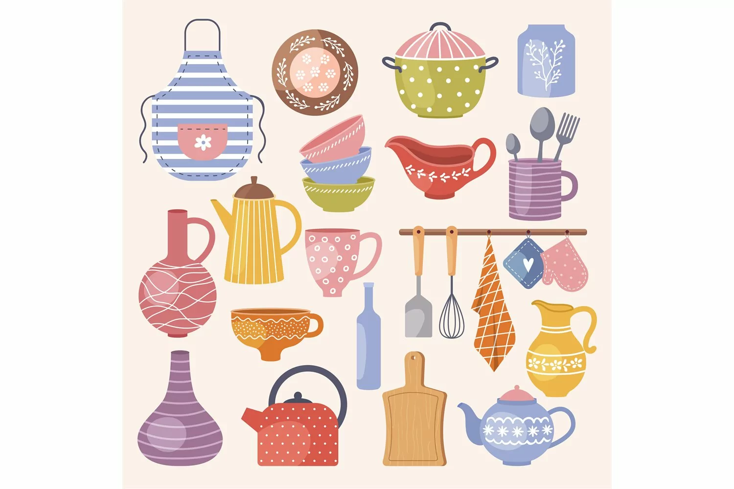 Decorative kitchen cookware. Dishes jug cups spoons plates forks vase mugs recent vector colored kitchen tools. Illustration of ceramic cookware and tableware