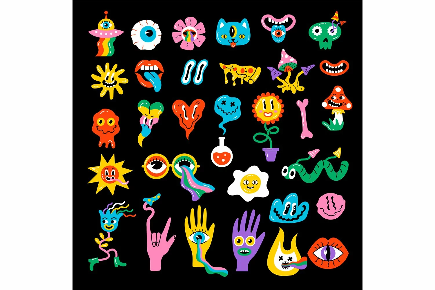 Hippy stickers. Neon psychedelic funny badges happy hallucination elements faces emoji mushrooms recent vector pictures set of psychedelic sticker trendy neon illustration