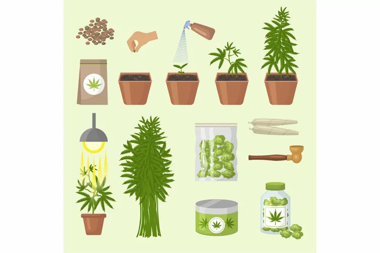 Cannabis. Industrial production botanical healthy marijuana planting processes cannabis farming recent vector colored cartoon set of cannabis to healthy illustration