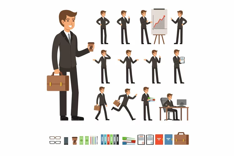 Vector set of businessman in different action poses with accessories. Funny characters businessman person in different pose, vector illustration