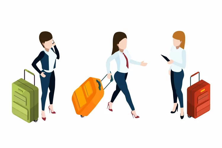 Business trip concept. Businesswomen with suitcases. Vector isometric luggage and girls. Luggage trip isometric, woman with suitcase illustration