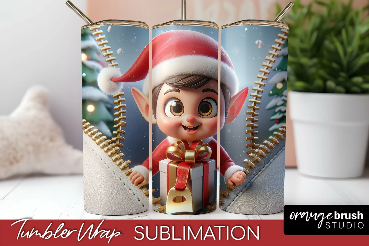3D Christmas Skinny Tumbler Wrap, Zip Wall Elf Sublimation