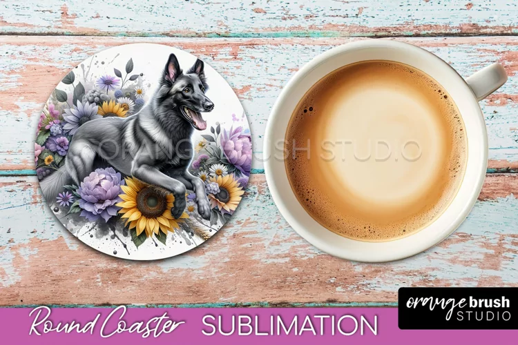 Belgian Malinois Round Coaster Dog Sublimation Floral PNG example image 1