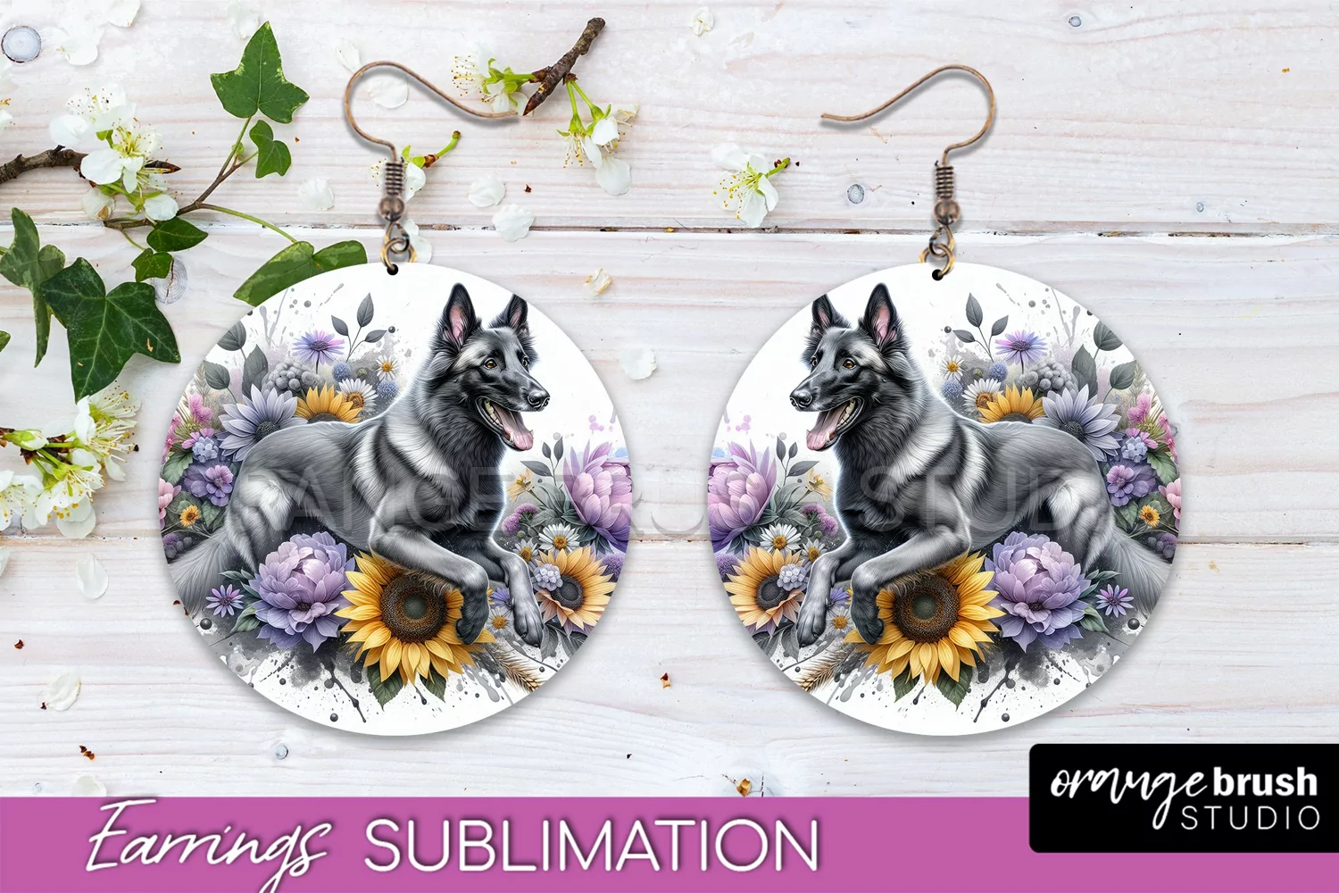 Belgian Malinois Earrings Dog Sublimation Floral PNG example image 1
