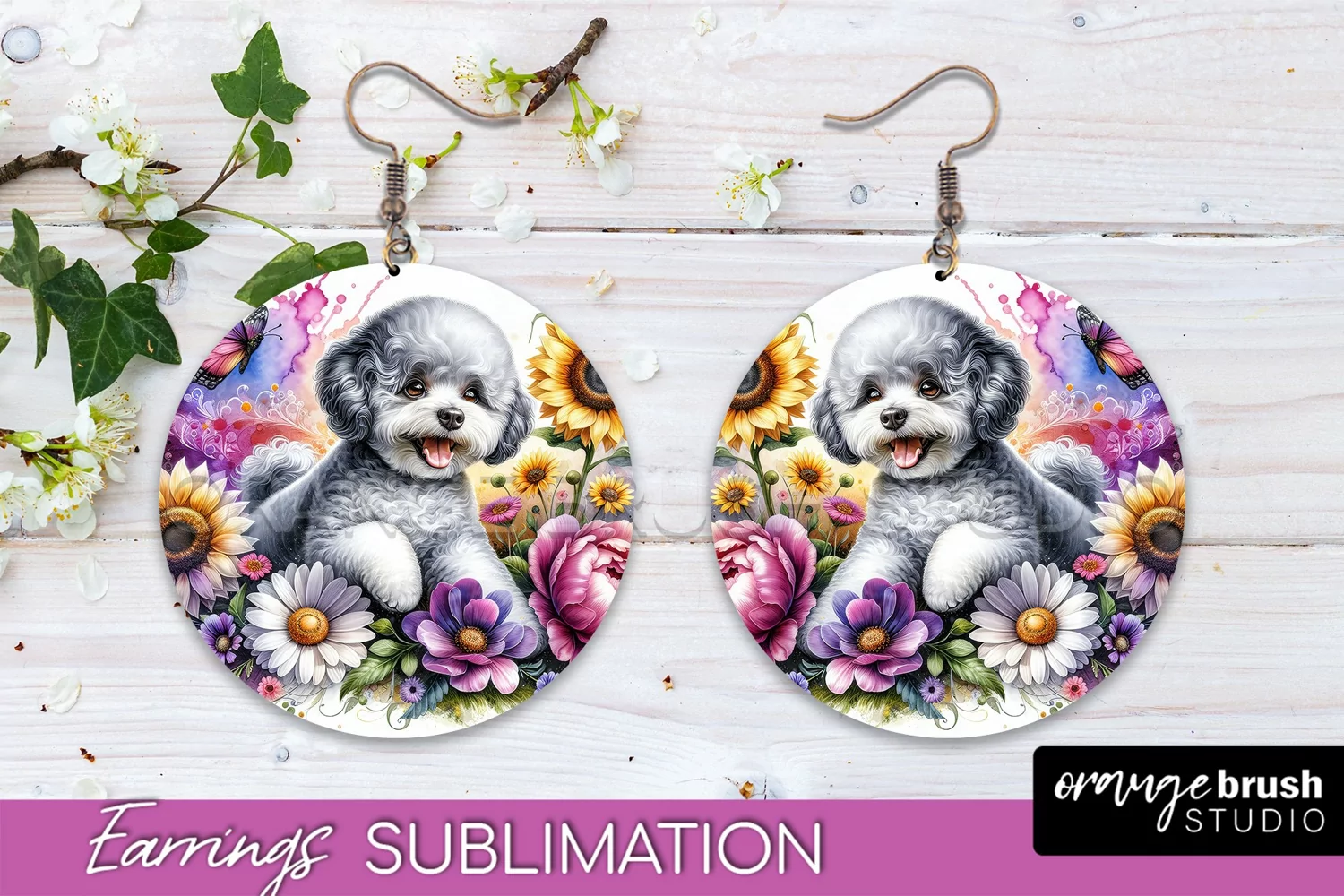Bichon Frise Earrings Dog Sublimation Floral PNG
