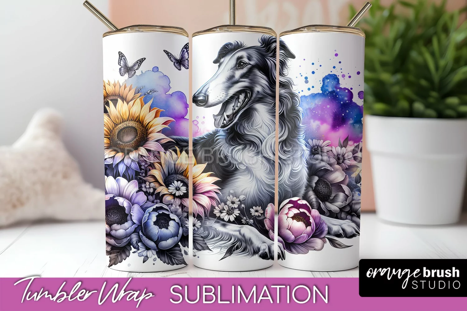 Borzoi Tumbler Wrap Dog Sublimation Floral PNG
