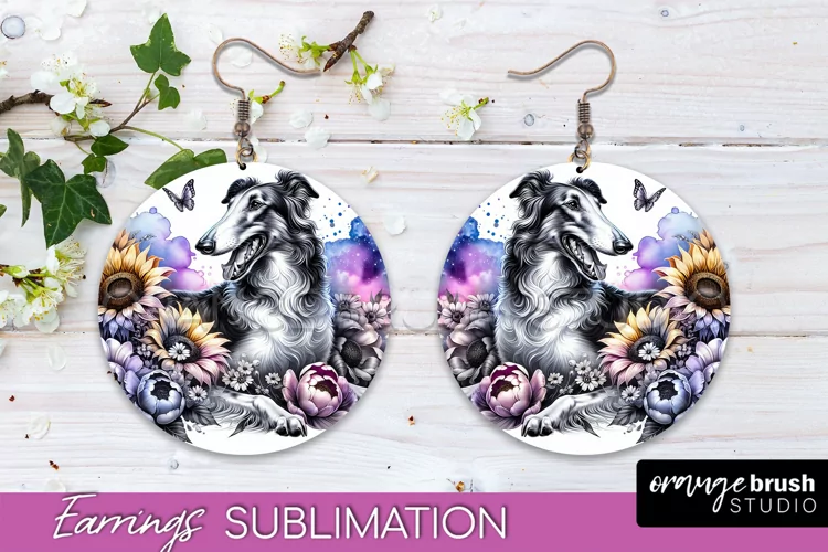 Borzoi Earrings Dog Sublimation Floral PNG example image 1