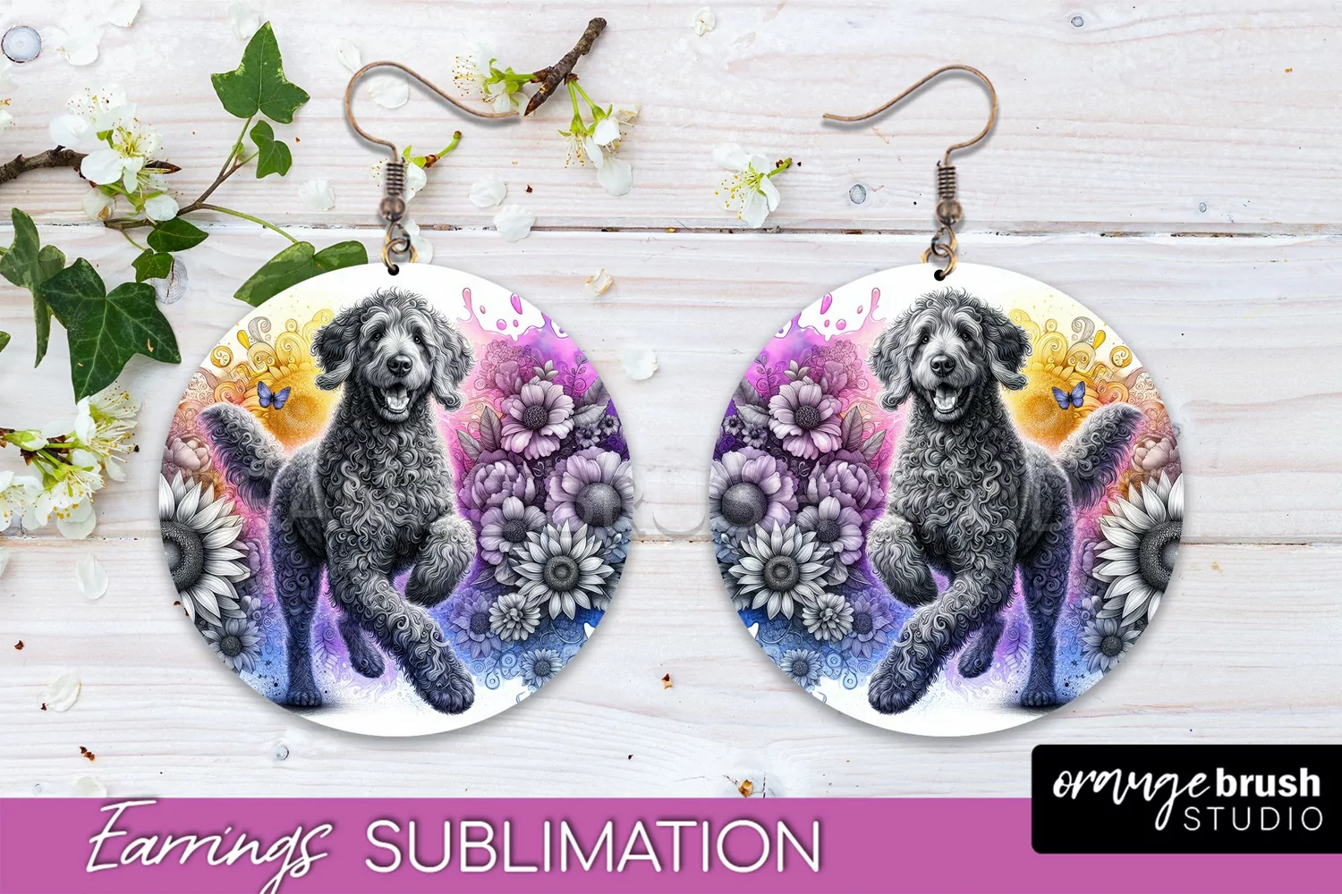 Curly-Coated Retriever Earrings Dog Sublimation Floral PNG