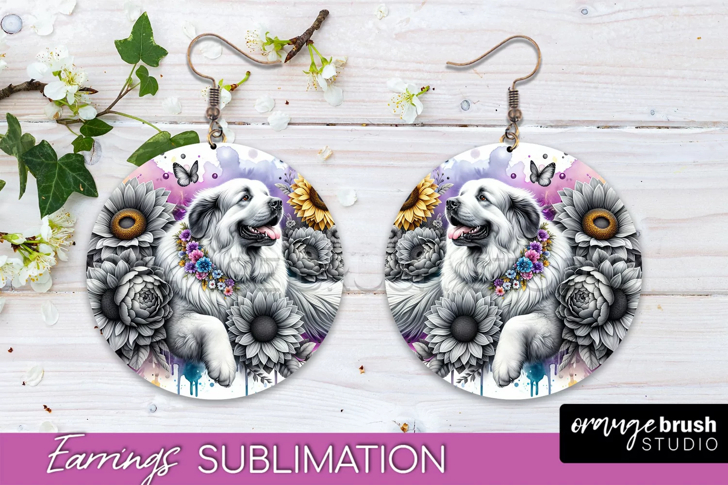 Great Pyrenees Earrings Dog Sublimation Floral PNG
