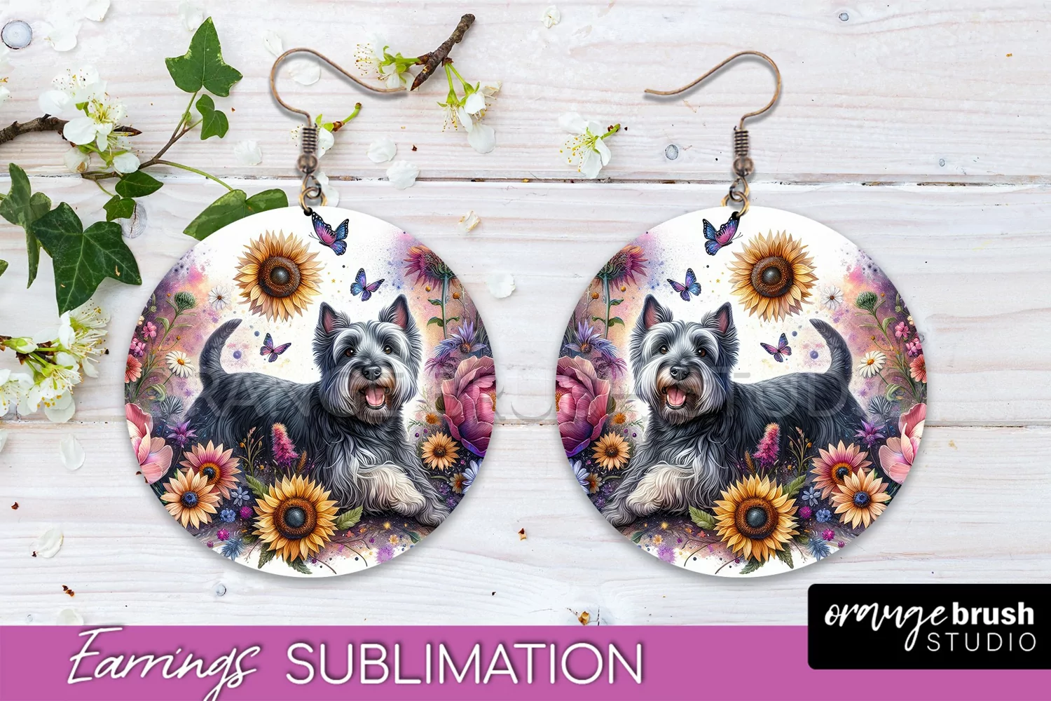 Scottish Terrier Earrings Dog Sublimation Floral PNG