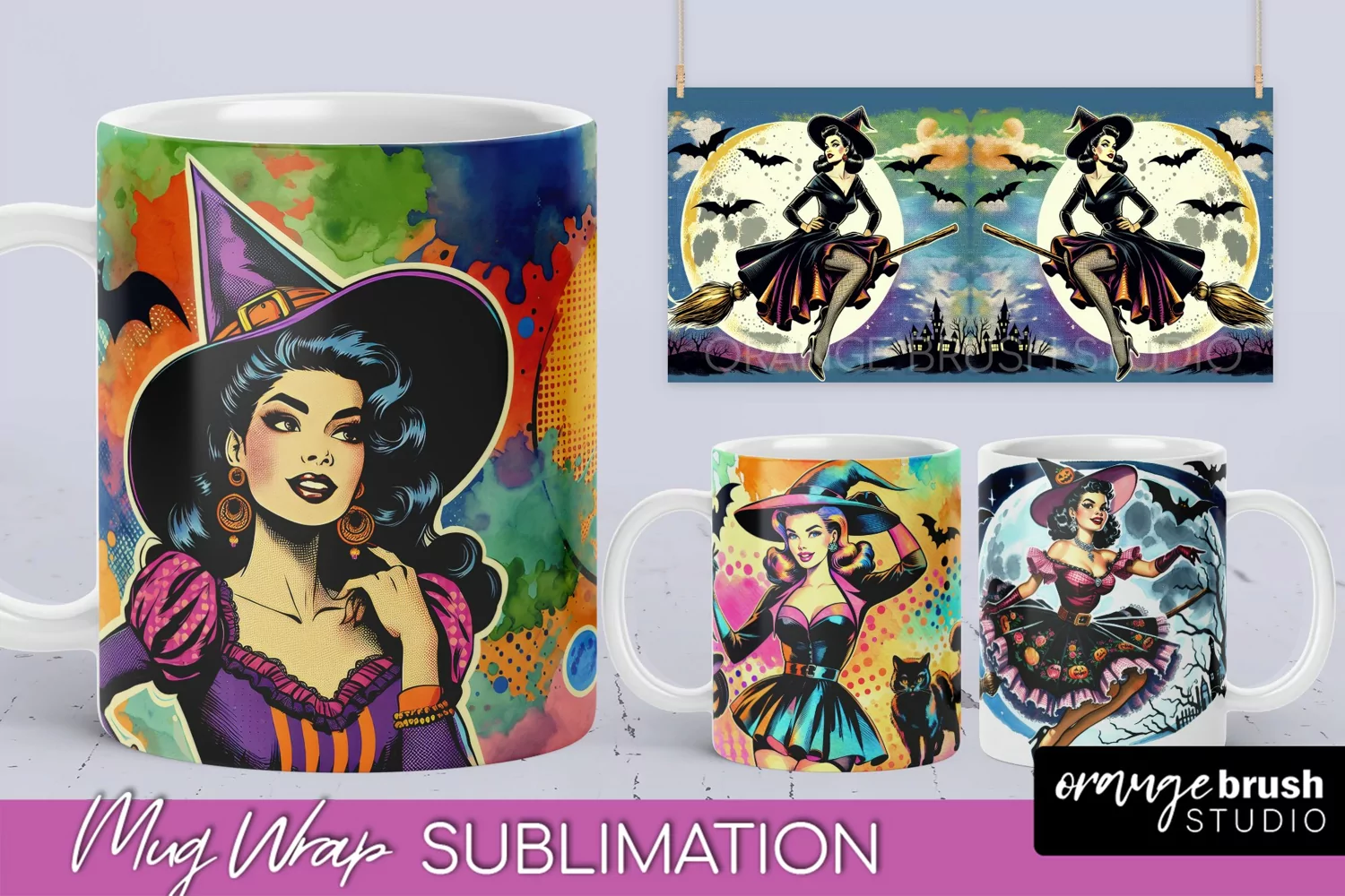 Witch Mug Wrap - Retro Halloween Mug Sublimation Designs