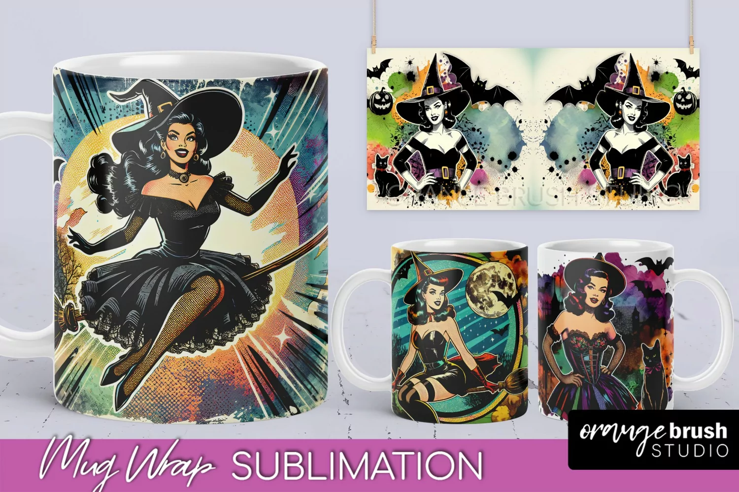 Witch Mug Wrap - Retro Halloween Mug Sublimation Designs