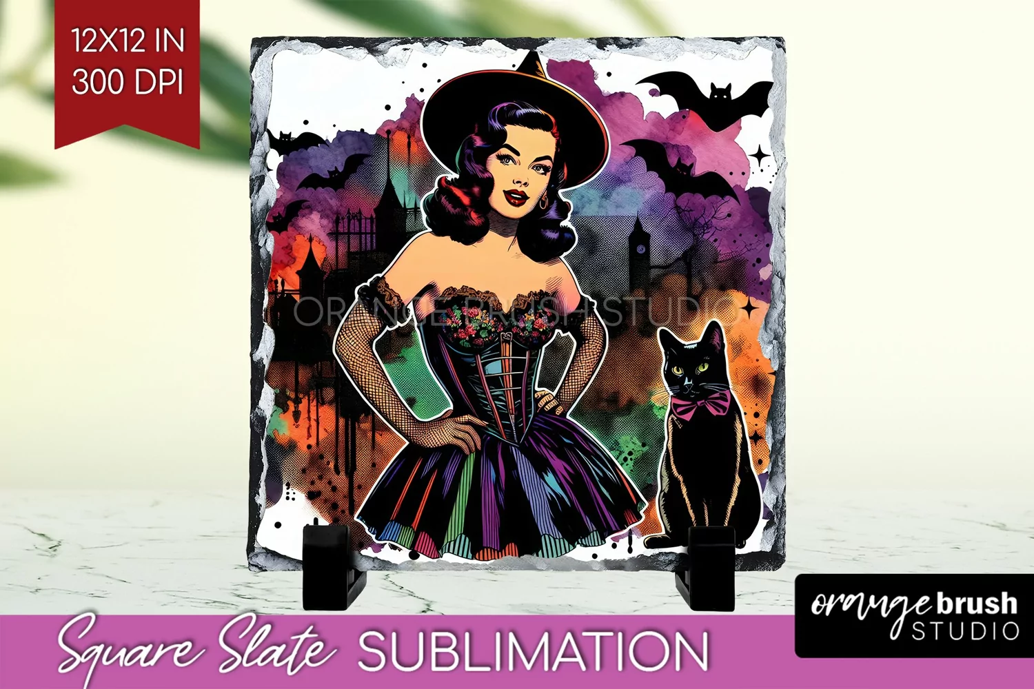 Retro Witch Slate PNG - Halloween Square Slate Sublimation example image 1
