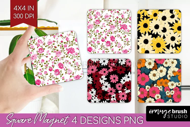 Retro Flowers Magnet Sublimation - Floral Square Magnet PNG example image 1