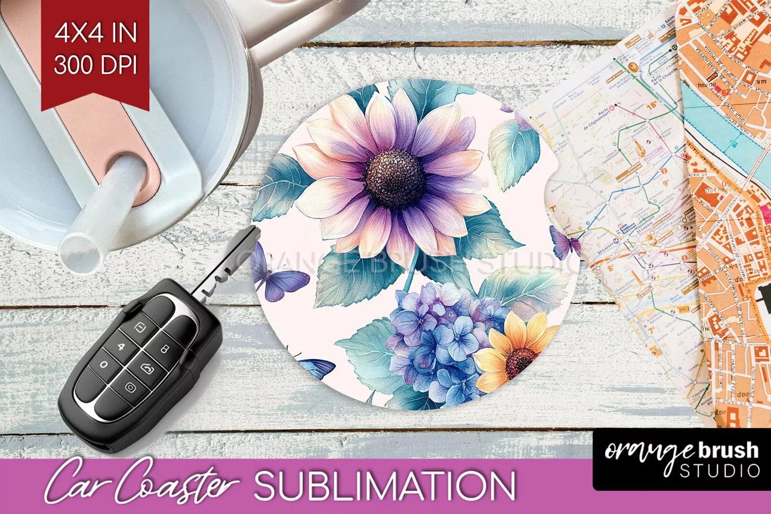 Car Coaster Sublimation Butterfly Car Coaster Sublimation Spring Flowers Car Coaster Floral Coaster Png