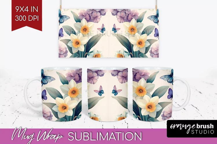 Mug Wrap Sublimation Floral Mug Png Butterfly Mug Sublimation Spring Flowers Mug Wrap