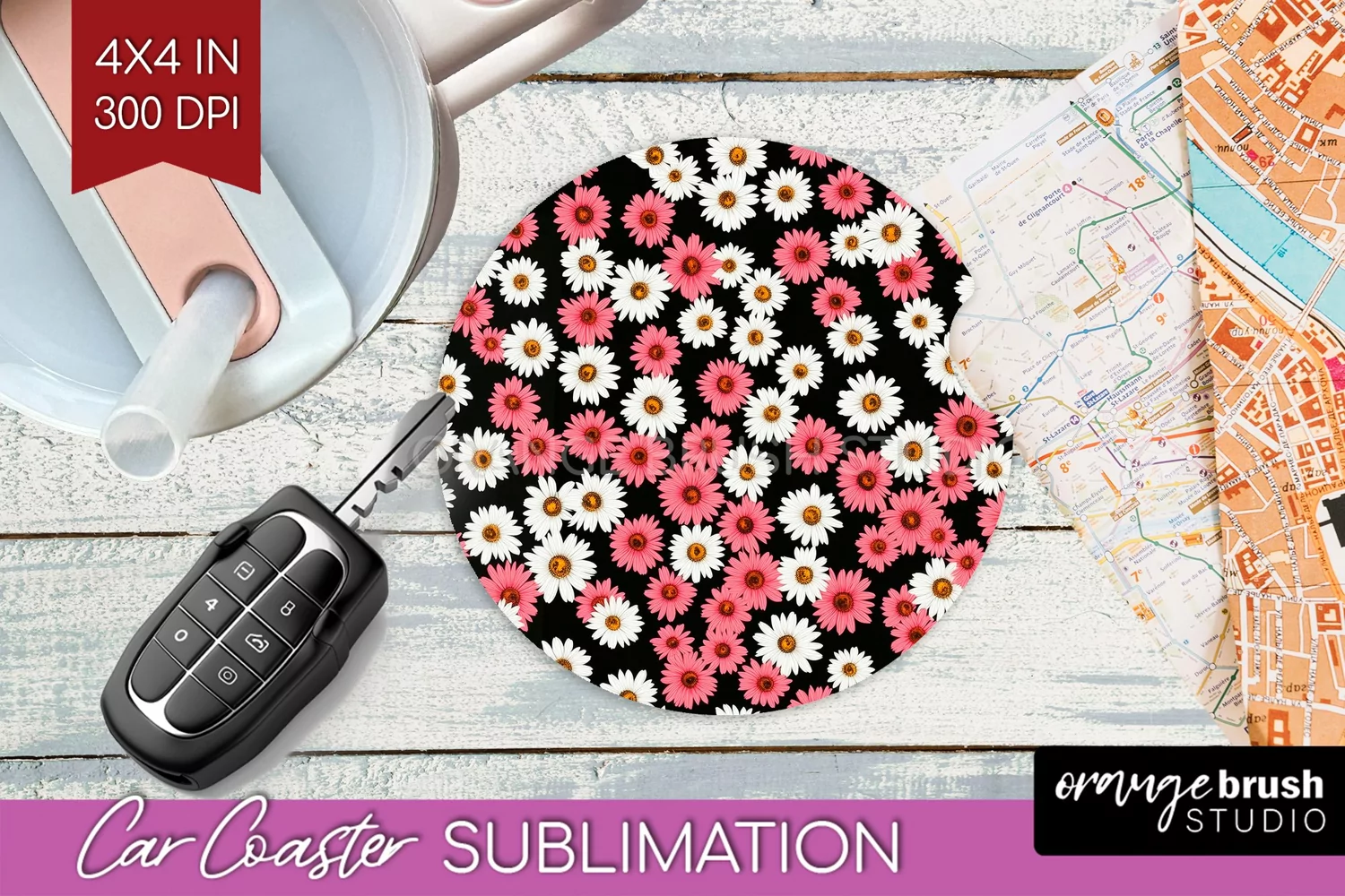 Retro Flowers Car Coaster - Floral Coaster PNG Sublimation