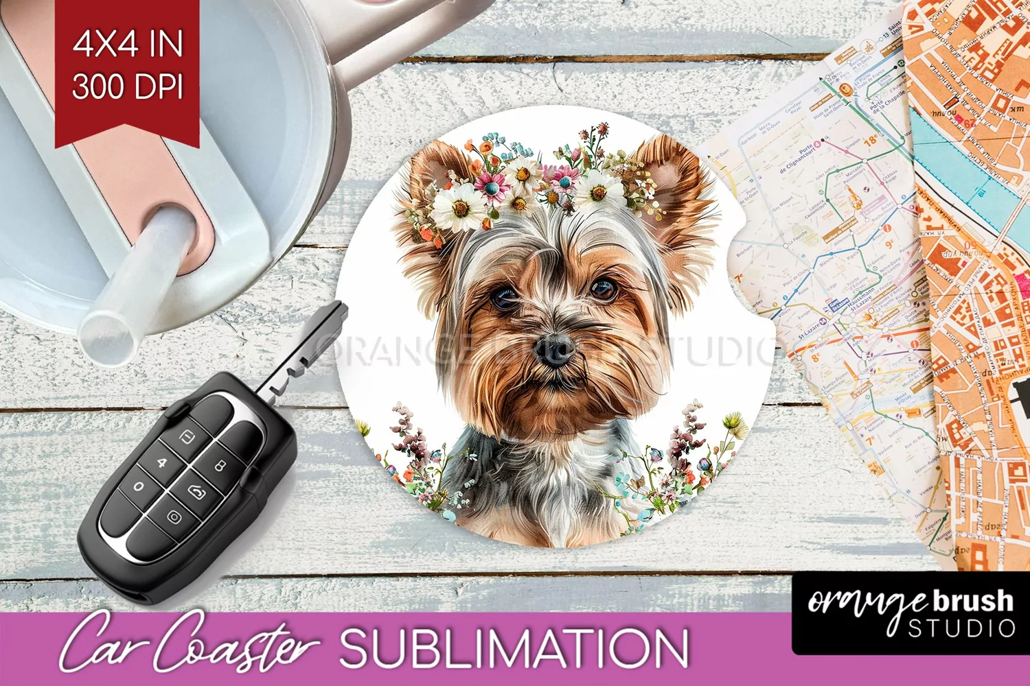 Floral Dog Car Coaster - Flowers Coaster PNG Sublimation