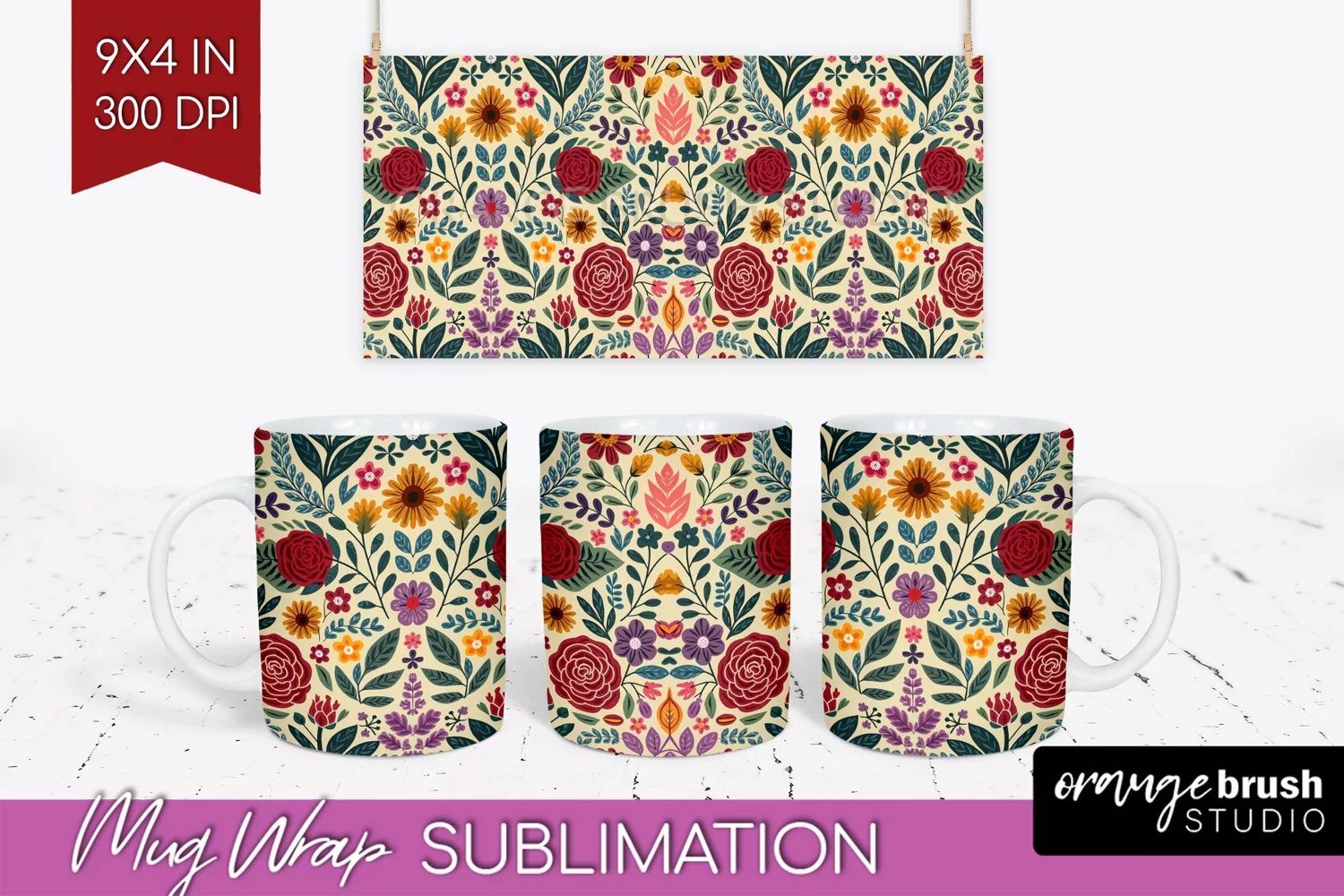 Folk Flowers Mug Wrap - Floral Folk Mug PNG Sublimation