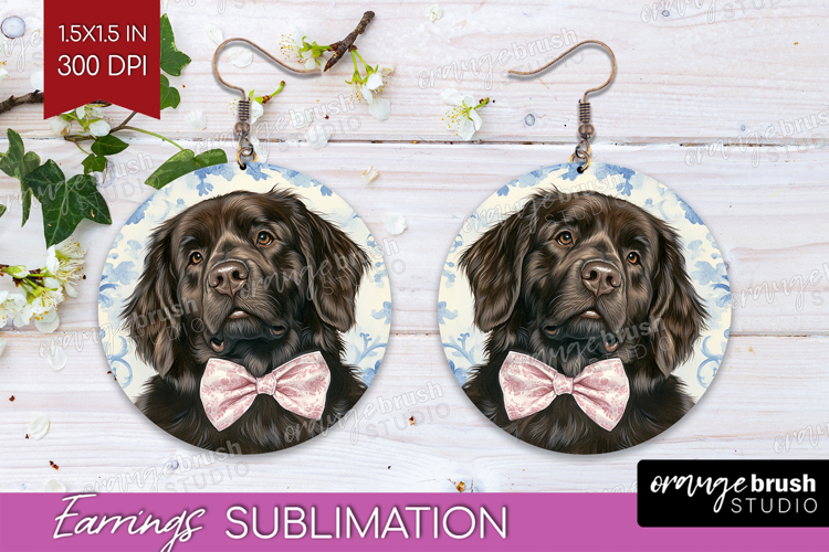 Newfoundland Dog Round Earrings Blue Toile PNG Sublimation
