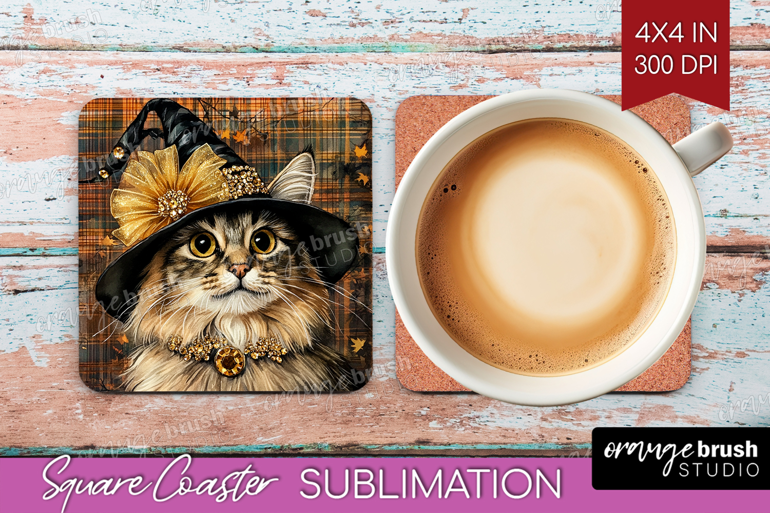 Halloween Cat Square Coaster - Witch Hat Coaster PNG