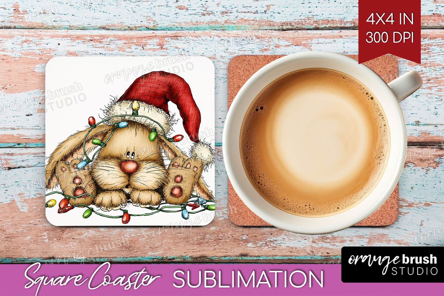 Rabbit Tangled In Christmas Lights Square Coaster Funny Xmas example image 1