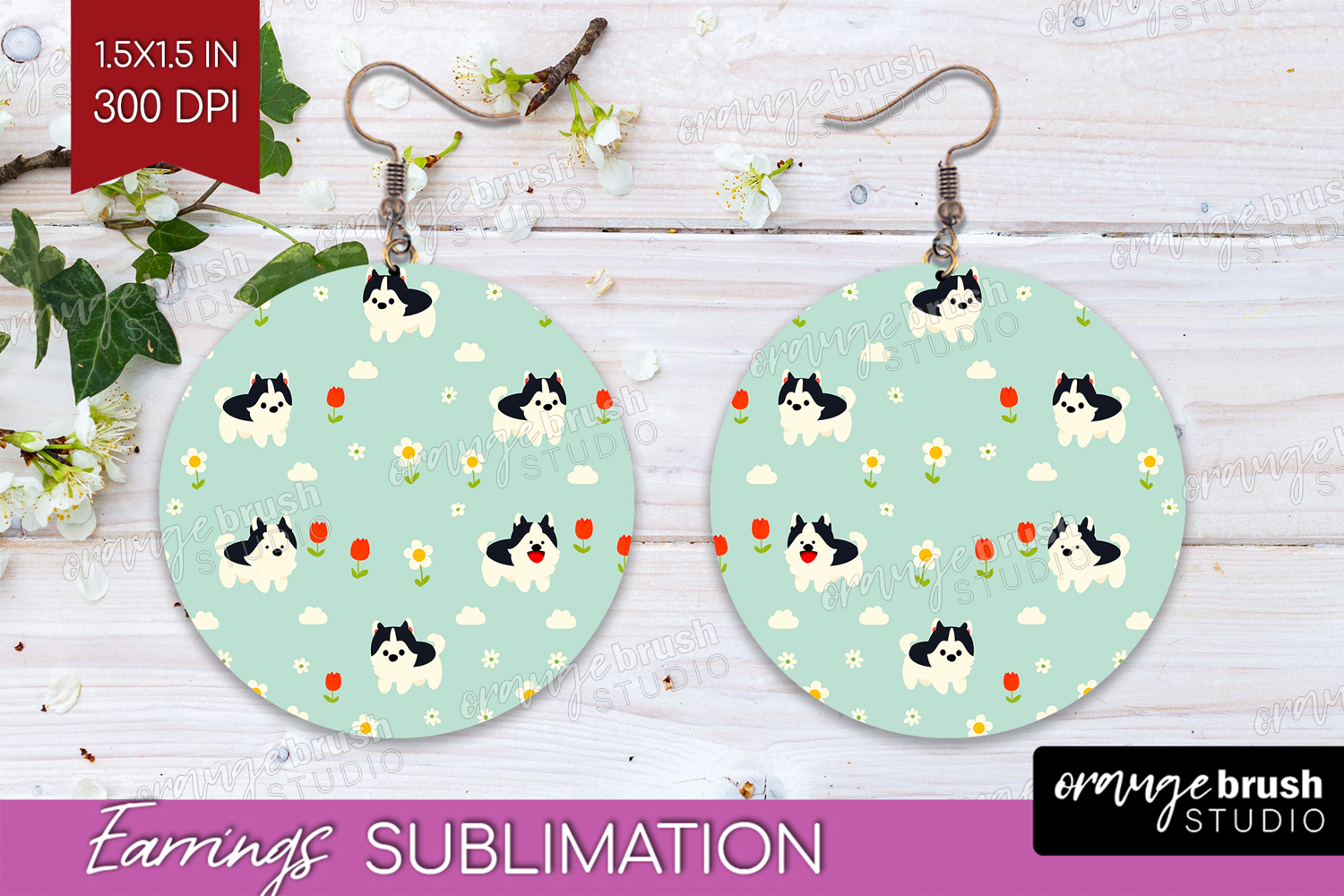 Husky Dog Round Earrings Cute Chibi Puppy PNG Sublimation example image 1