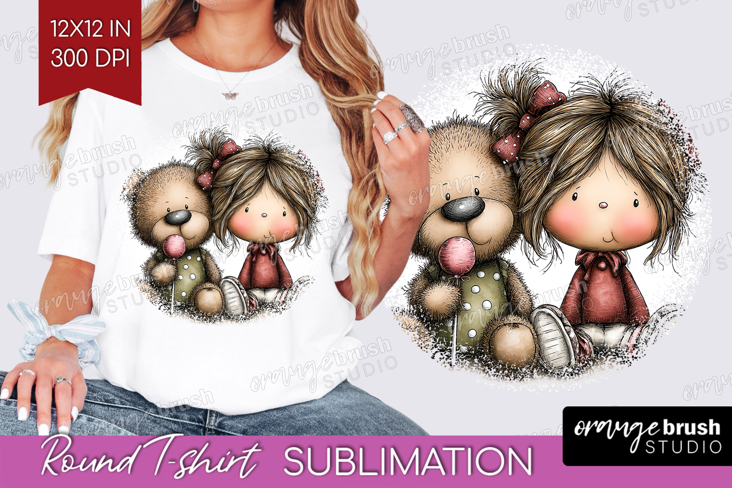 Girl and Bear Valentine Round Tshirt Background Whimsical example image 1