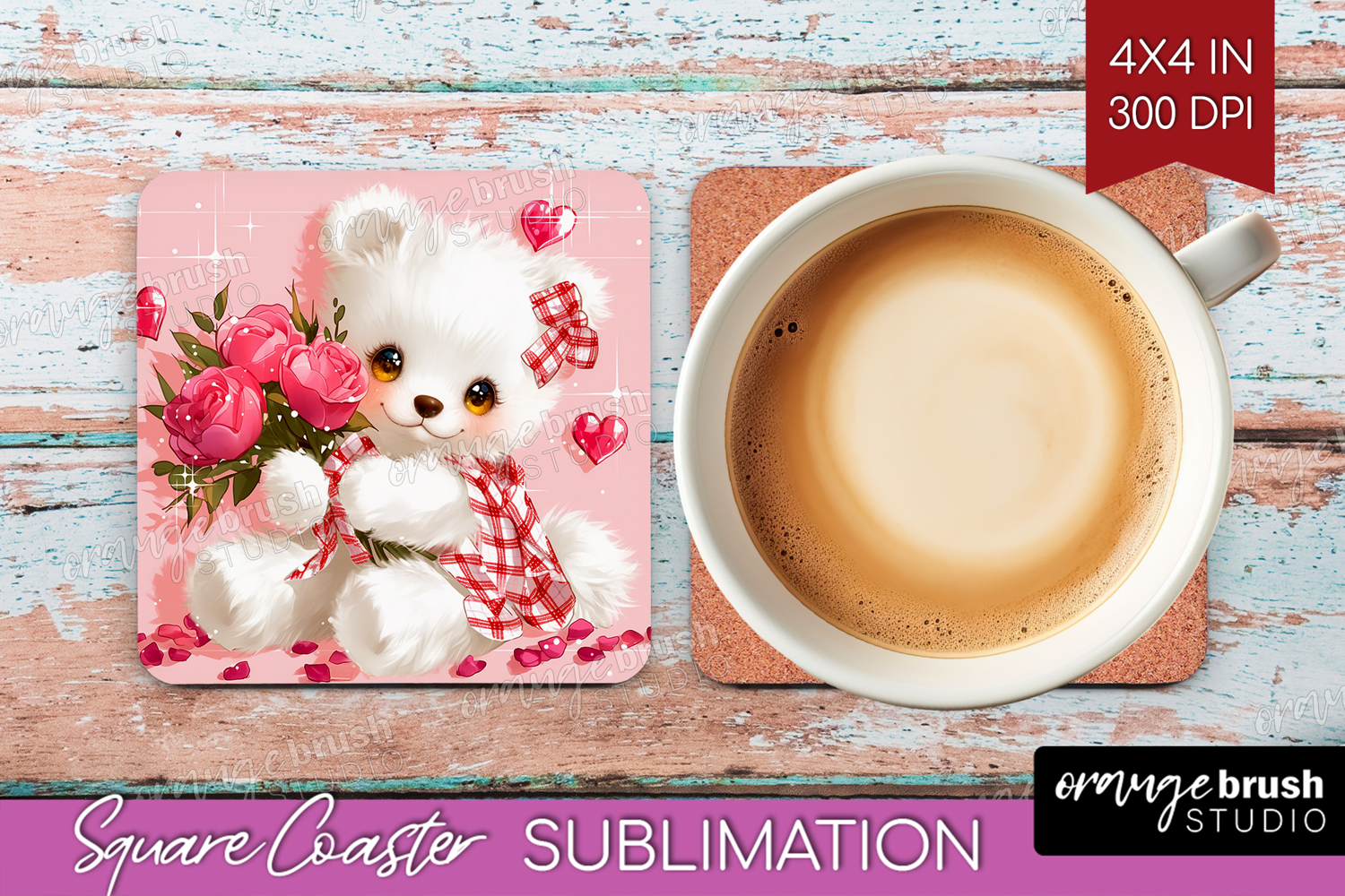 Bear and Roses Valentine Square Coaster Cute Valentines Day example image 1