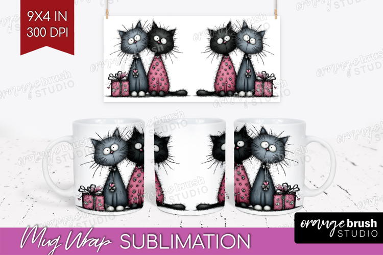 Whimsical Cat Mug Wrap - Valentines Day Mug PNG Sublimation