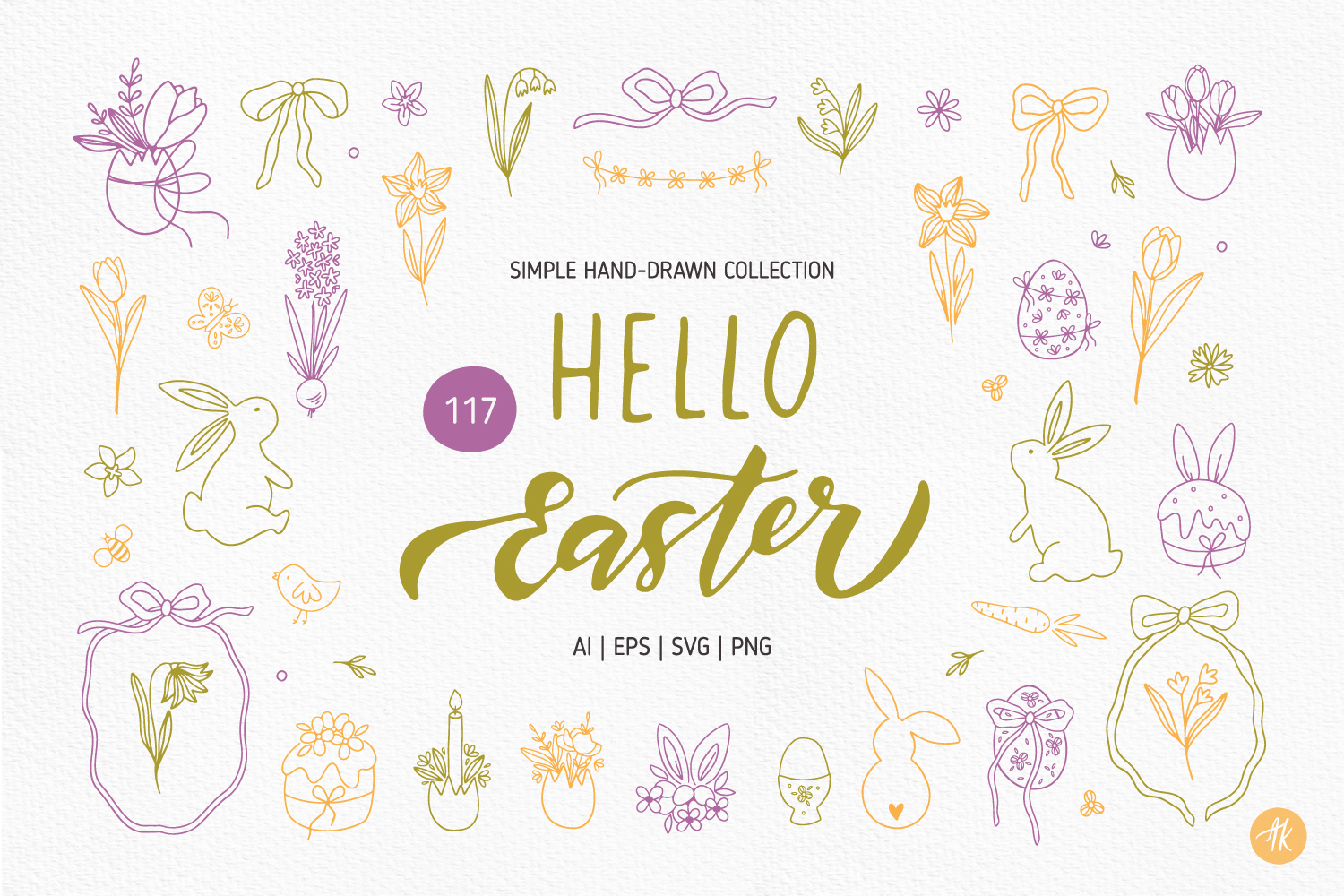 It’s simple hand-drawn whimsy vector collection includes minimal line art illustrations of Easter bunny, eggs, spring flowers – tulips, hyacinth, decorative frames, bows, floral doodles, Happy Easter quotes.