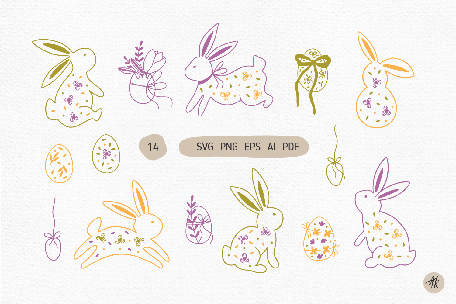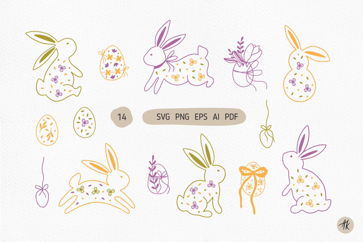 Easter Bunny SVG Bundle, Easter Eggs PNG Cliparts– it’s simple hand-drawn whimsy collection 14 minimal line art illustrations of Easter bunny, floral eggs, spring flowers.