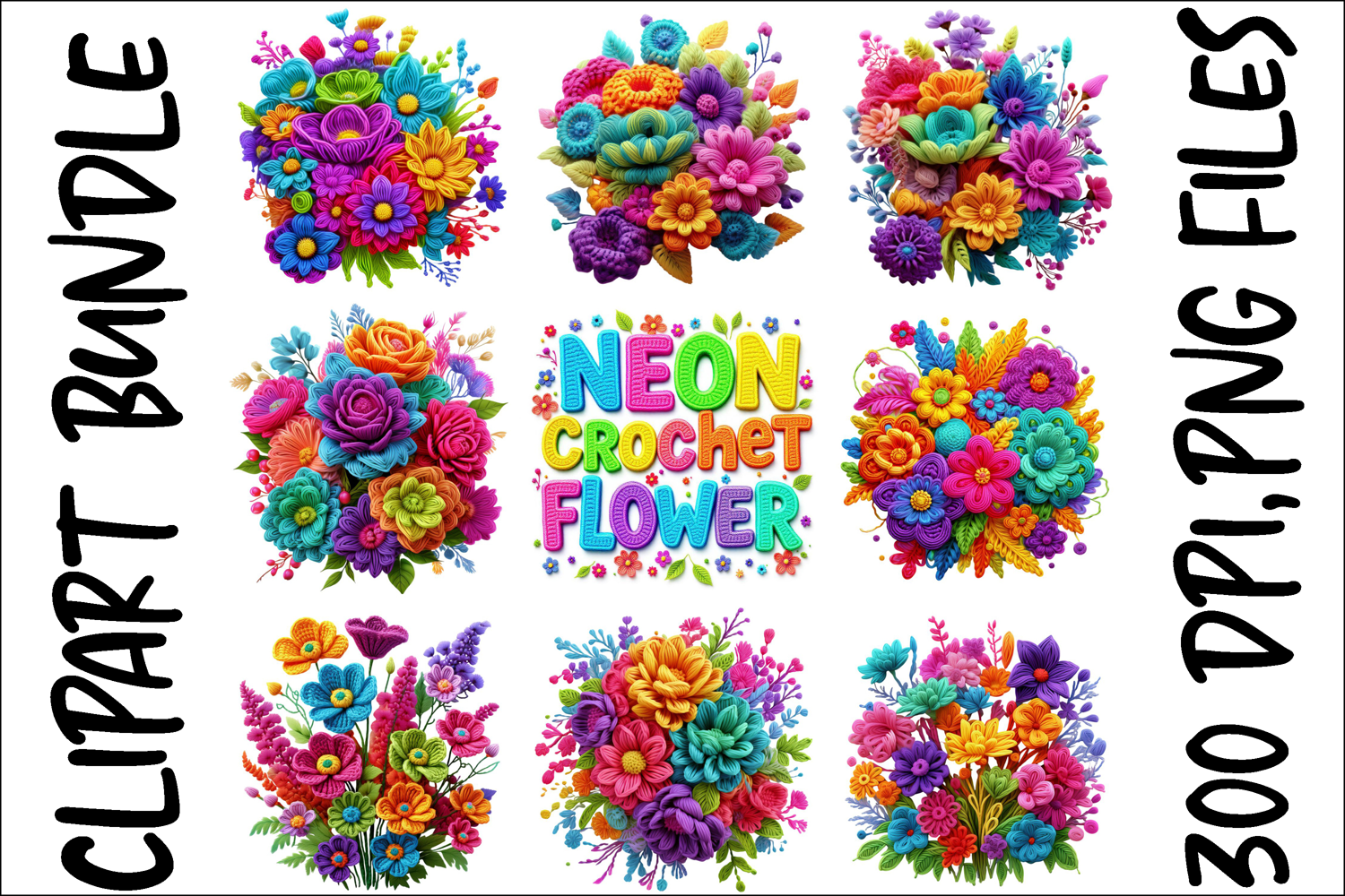 Neon Crochet Flower Clipart Bundle Bright Yarn Floral PNGs