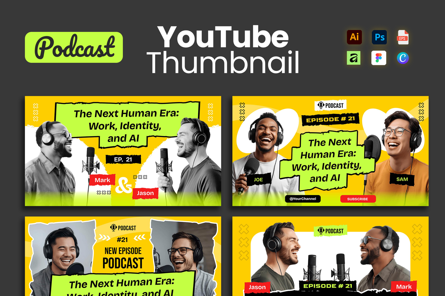 Elevate your podcast or talk show's visual branding to professional standards with our Creative YouTube Thumbnail Templates. Designed for maximum impact and click-through rates, these templates feature high-contrast colors, bold typography, and strategic layouts (like split screens or framed host images) that instantly convey episode energy and topic focus