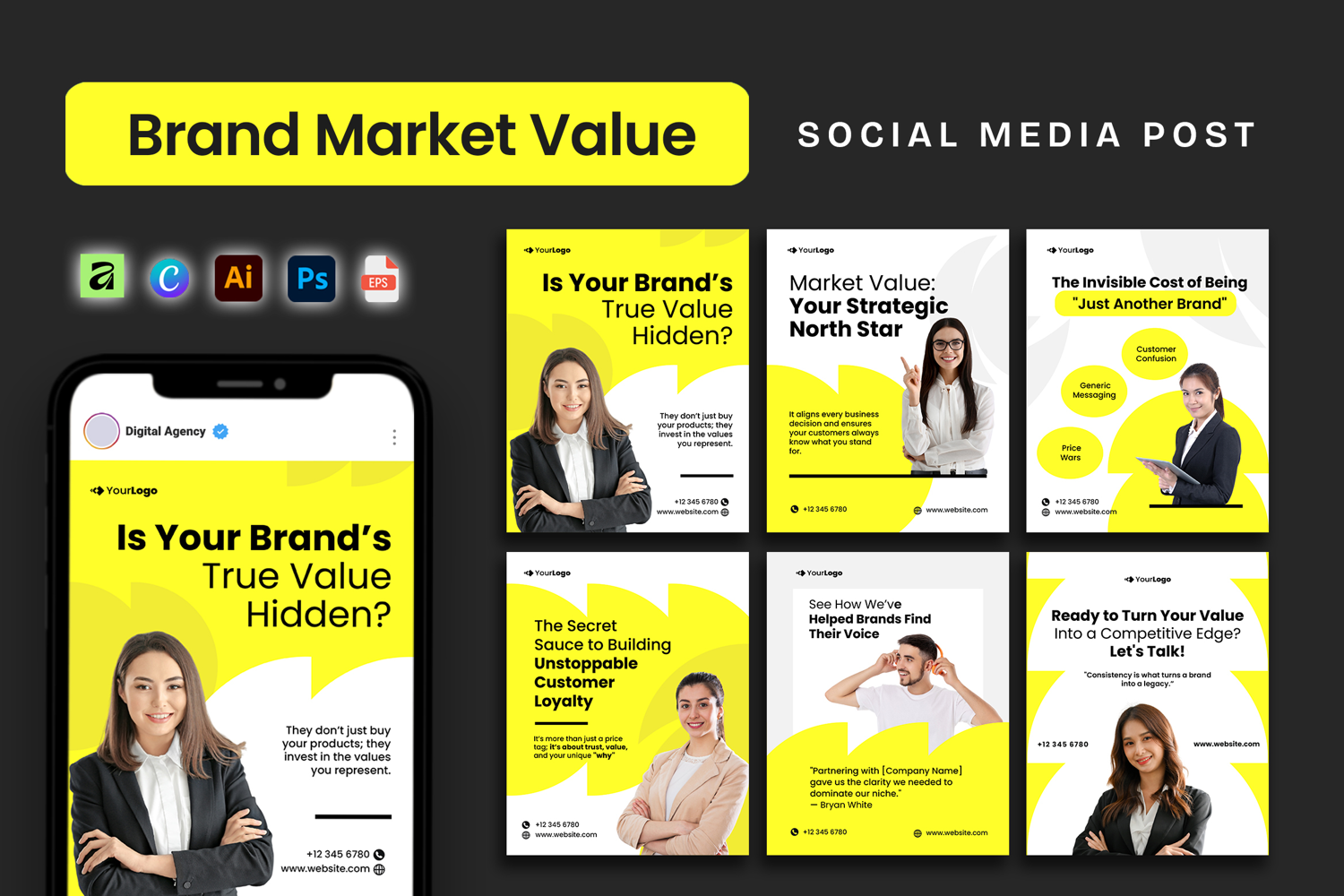 Unlock the secret to brand authority with this clean, professional social media template kit. **Designed specifically for Digital Agencies, Brand Consultants, and Business Coaches**, this set helps you transform complex topics like "Market Value" into visually engaging content that builds trust and stops the scroll.