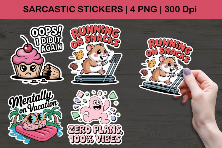 Bring humor to your projects with these Sarcastic Funny Stickers, featuring four playful and relatable designs including “Oops! I Did It Again,” “Running on Snacks,” “Mentally on Vacation,” and “Zero Plans, 100% Vibes.” These high-quality PNGs are perfect for planners, journals, water bottles, laptops, scrapbooks, greeting cards, and crafting machines like Cricut and Silhouette.