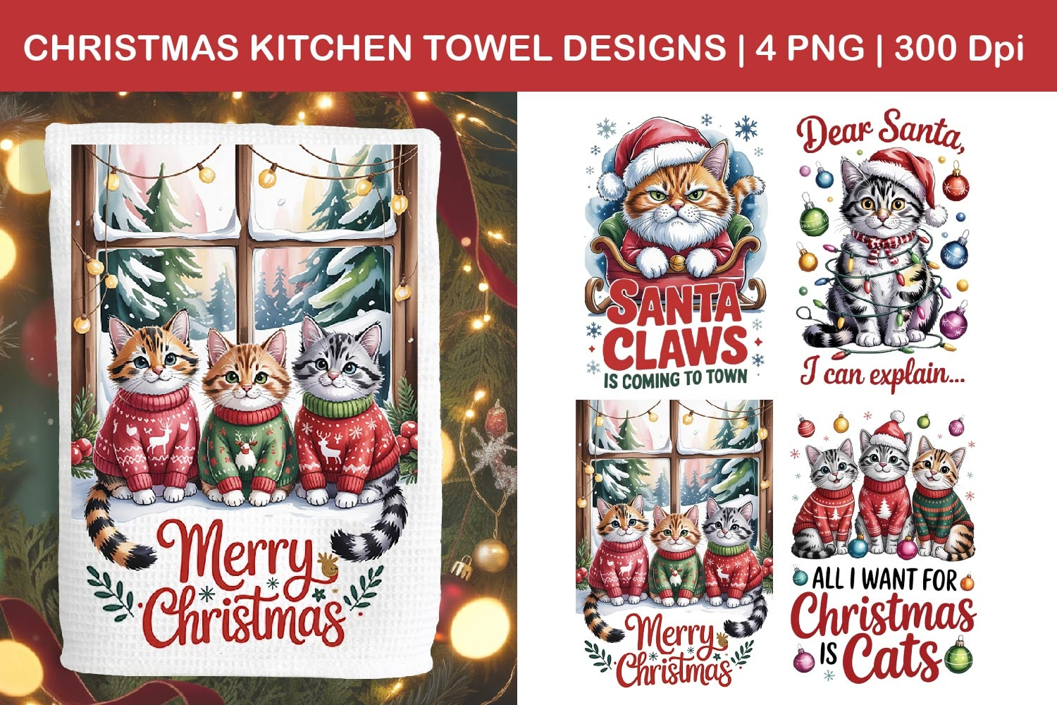 Christmas Cat Kitchen Towel Designs | Holiday Cat PNG Art