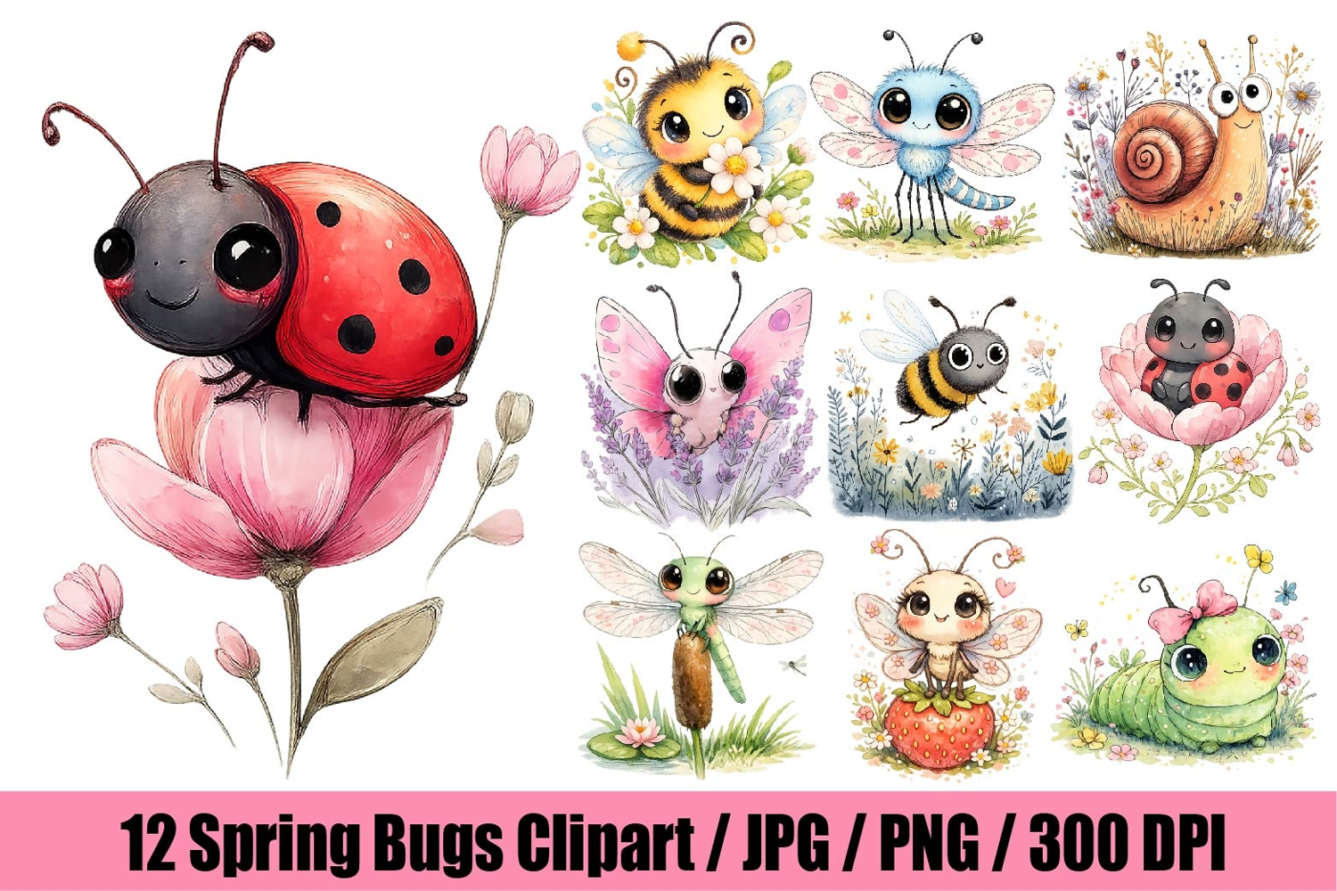 12 Spring Bugs Clipart Bundle, Watercolor Insects PNG