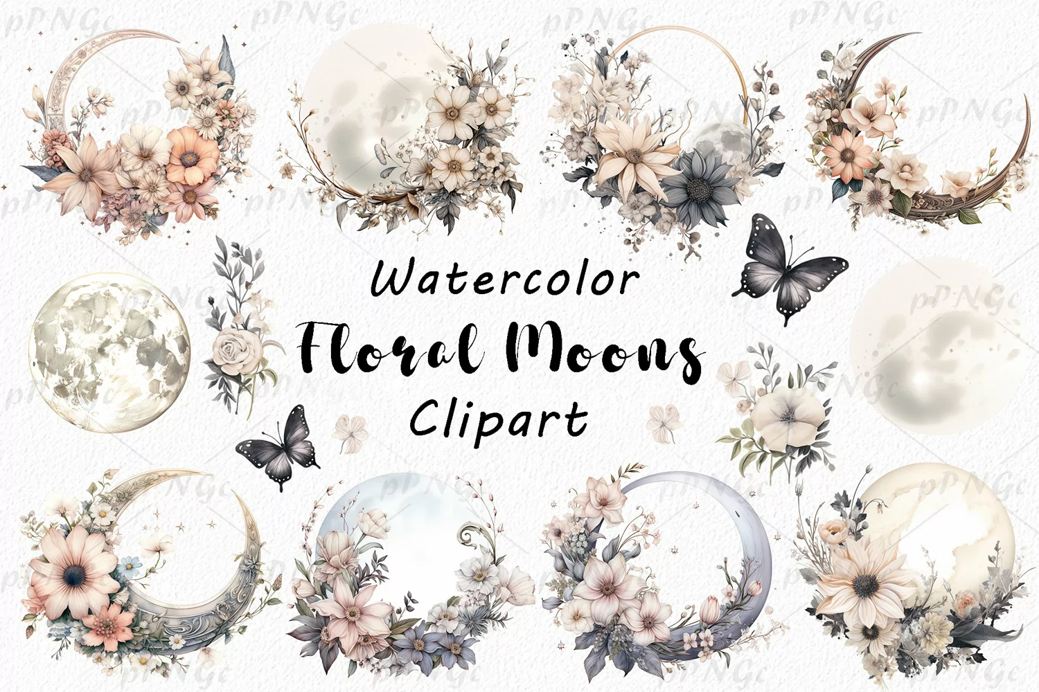 Watercolor Floral Moons Clipart