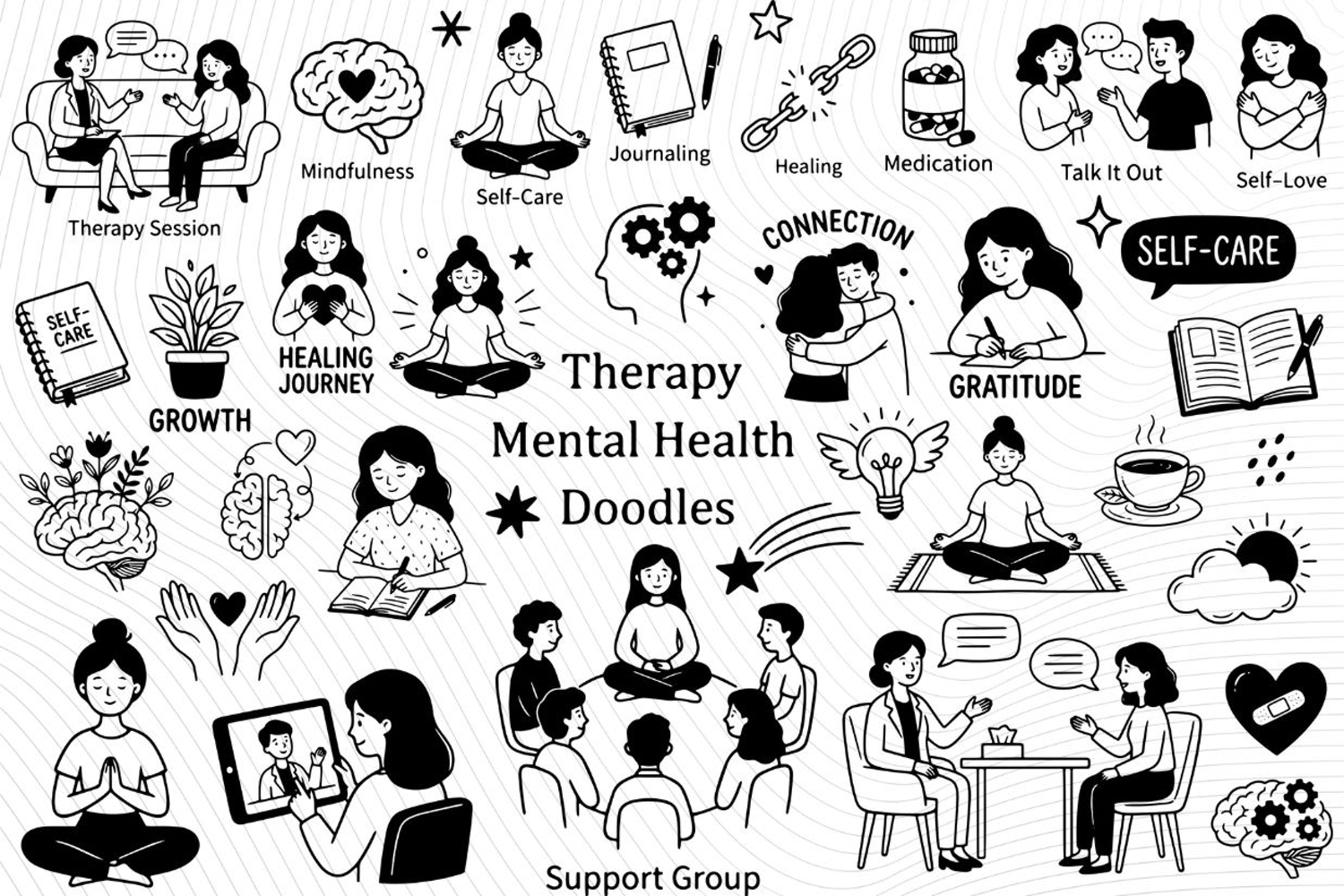 Explore a thoughtful collection of hand-drawn doodle illustrations centered on mental health, therapy, and self-care. This versatile bundle is perfect for creating supportive resources, wellness planners, social media content, stickers, and more.