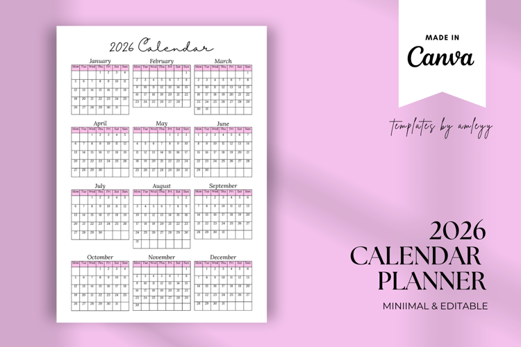 2026 Calendar Planner Template – Editable Canva Planner, Minimalist Yearly & Monthly Digital Calendar, Printable PDF, Aesthetic Layout