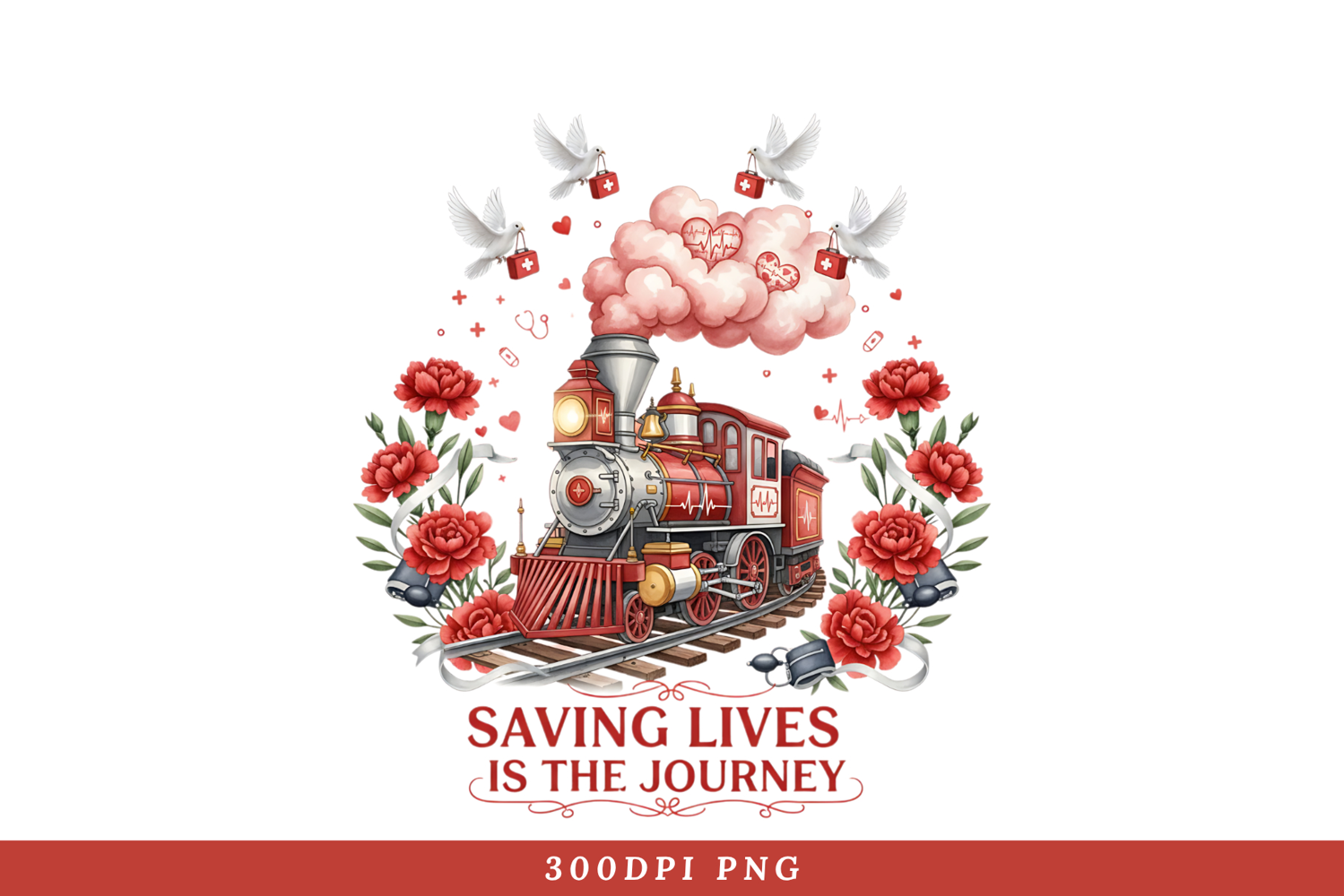 Saving Lives is the Journey" Nurse Train PNG - Medical Steam Engine Sublimation DesignCelebrate the dedication and passion of healthcare workers with this stunning "Saving Lives is the Journey" Sublimation PNG. This detailed, vintage-inspired design features a classic red and silver steam train moving forward on a medical mission. The train is richly adorned with vibrant red roses and ribbons, symbolizing love and commitment, while the smokestack emits clouds of steam containing hearts, ECG lines, and medical crosses.
