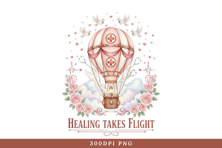 "Healing Takes Flight" Hot Air Balloon PNG - Vintage Nurse Sublimation DesignInspire creativity and celebrate the journey of care with this enchanting "Healing Takes Flight" Sublimation PNG. This vintage-inspired watercolor design centers on a beautiful pink and white hot air balloon adorned with medical crosses, symbolizing safe transport and healing.