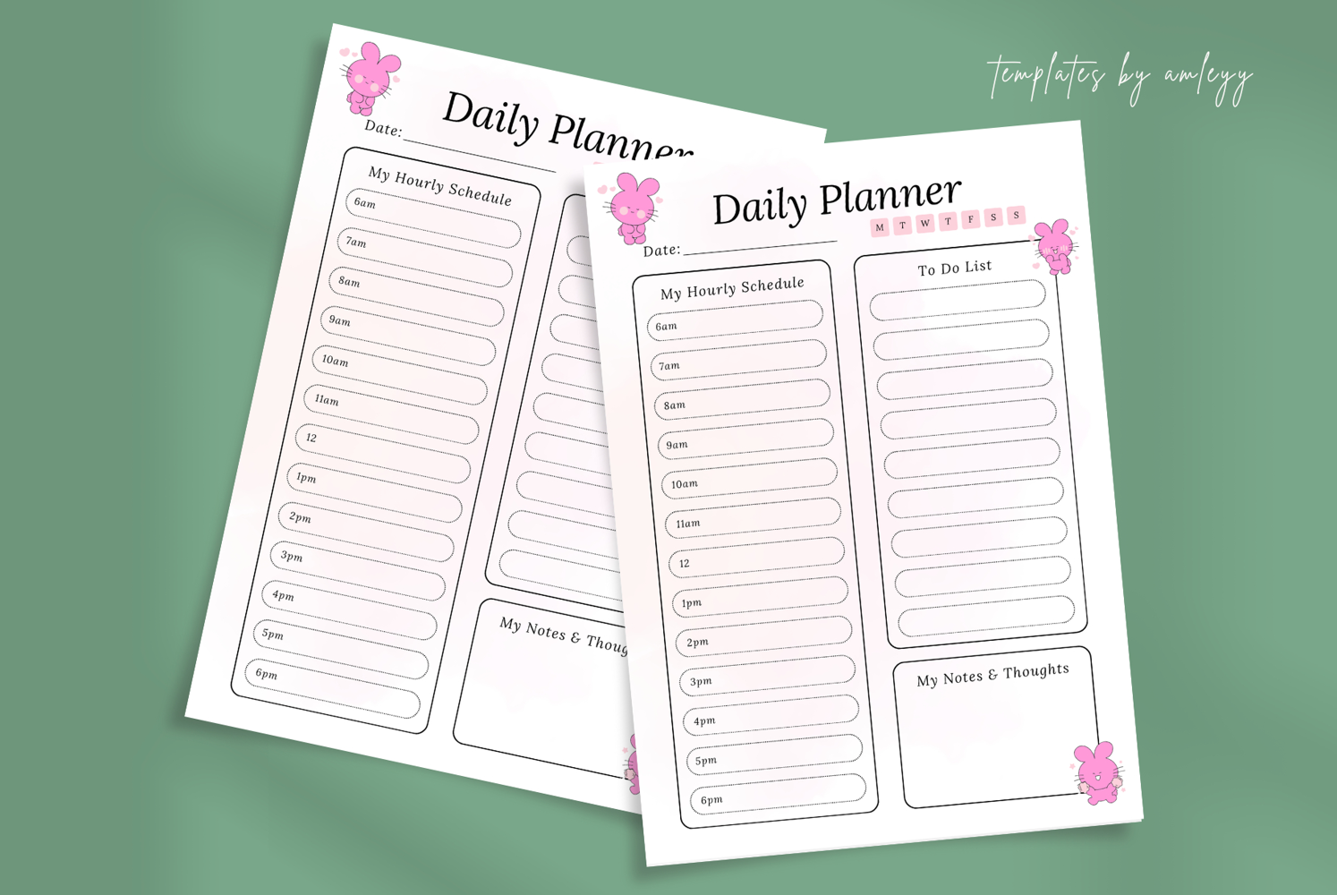 Kawaii Daily Planner Template (Canva) - Cute Pink Bunny Hourly Schedule & To Do List PrintableBoost your productivity and bring a smile to your face with this Adorable Kawaii Daily Planner Template! Designed specifically for Canva, this template is perfect for students, busy professionals, or anyone who loves a cute, organized aesthetic. The soft pink color palette and charming bunny illustrations make planning a joy, not a chore.