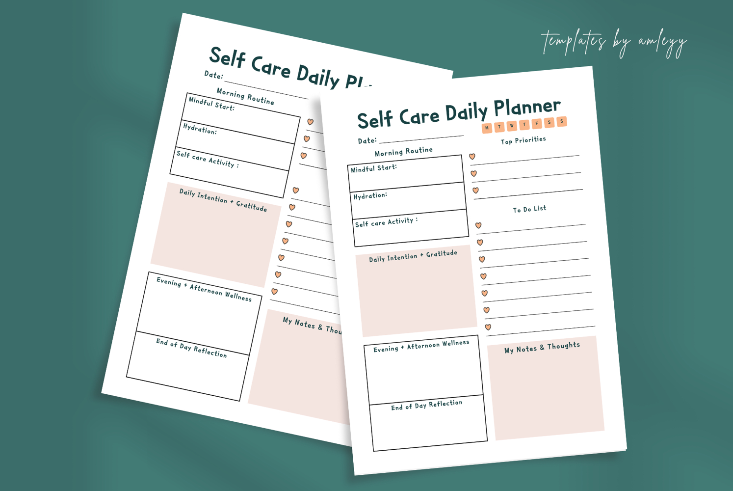 - Focused on wellness + productivity: includes sections for self-love rituals, mood check-in, hydration, gratitude, top priorities, to-do list, schedule, and end-of-day reflection.