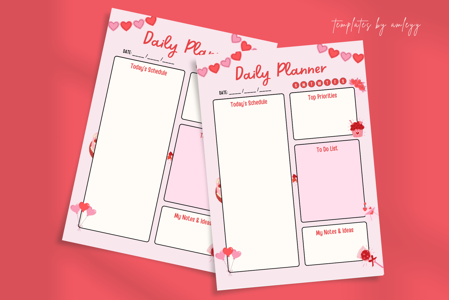 Valentine Daily Planner Template — Cute Pink Heart Planner Page — Romantic Aesthetic Printable — Editable CANVA Template — Love-Themed Daily Schedule