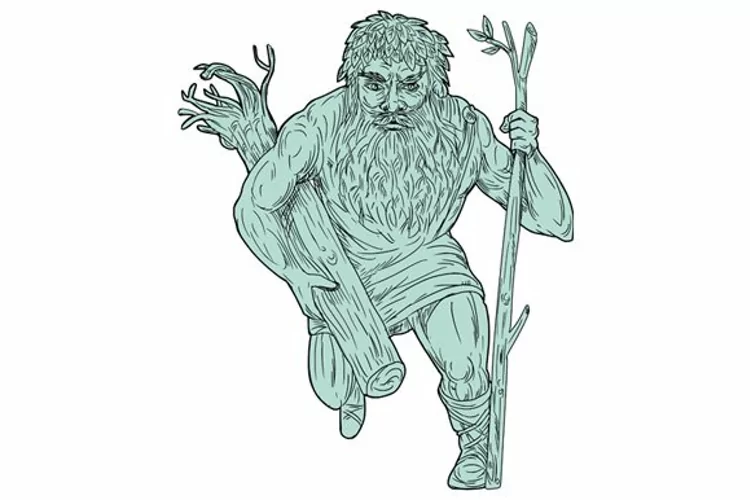 Drawing sketch style illustration of a leshy or Leshiye , a tutelary spirit of the forests in Russian or Slavic folklore holding tree trunk and staff viewed from front on isolated white background.