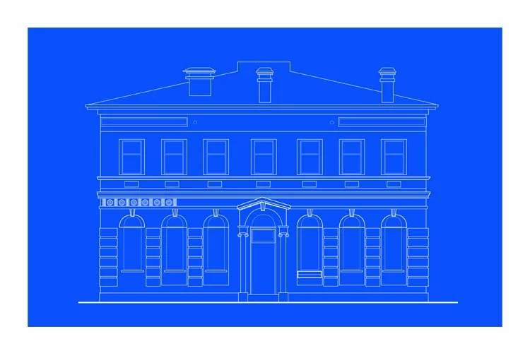 line drawing illustration of a heritage mansion building viewed from front elevation on blue background. **The downloadable zip includes editable vector EPS and  hi-res JPG format.**