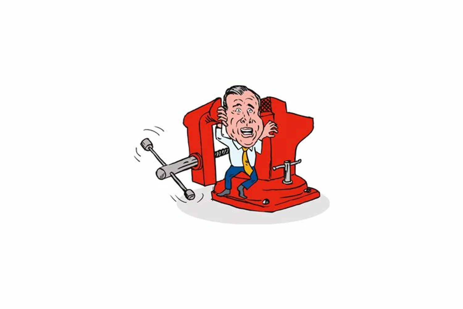 Illustration of man squeezed on adjustable clump vice grip set in white background done in retro style.  Digital download zip contains a vector EPS and hi-res JPG. JPG dimension is at least 3000px on shortest side.